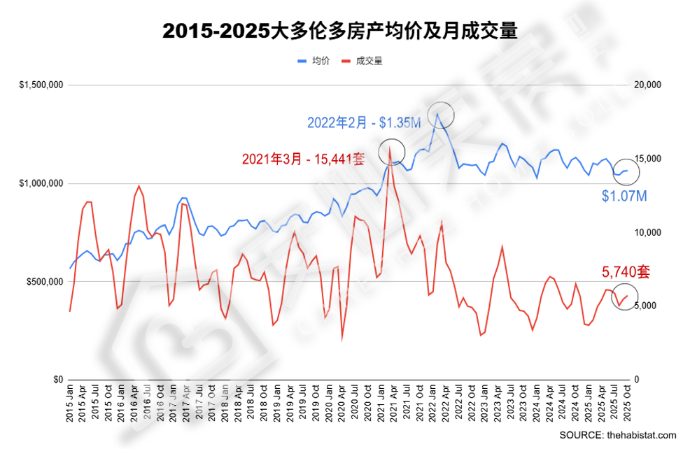 從 2015–2025年大多倫多地區房價與月成交量趨勢圖來看,房價自2022年高點 $1.34M 回調至目前 $1.05M,整體跌幅超過 20%。不過,主要的下跌集中在 2022年升息初期的前六個月。