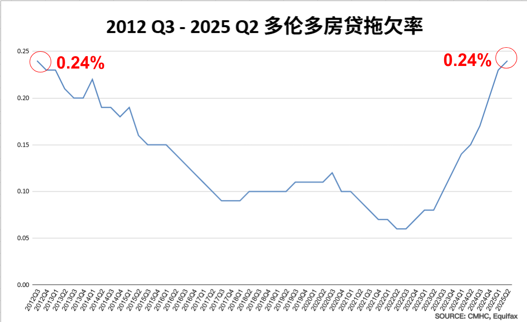 根據 Equifax 提供、CMHC 發布的 Toronto CMA 房貸拖欠率圖表顯示: